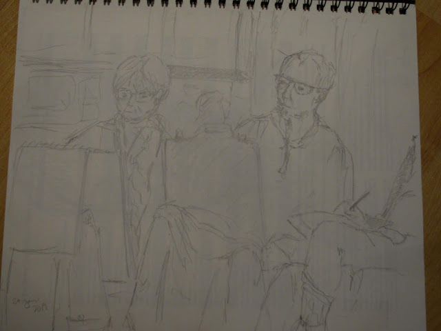 It's time for T-shirts to replace the thawbs (okay, I just looked that up, and you can, too) but I still have winter-clothed figures on the easel and for artistic purposes, I'm going to miss those winter garments. The piece I just finished is based on a young woman I saw on the bus --white-blonde hair, light cream coat with black sleeves, rich golden-orange scarf and headband, and red boots!!!