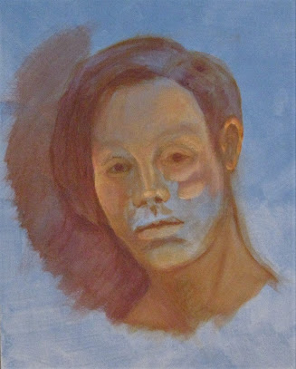 I tried various sketched poses and eventually decided on a sitting pose and did some painted studies of a face that might be useful. Working from a scaled-up magazine shot -- conveniently the reverse of the pose I'd decided on -- I laid out the basic composition.