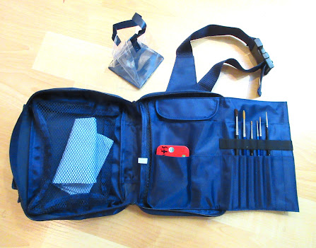 This inspiration recalled a little travelling art pack I'd once won in a draw – perfect for the important job of protecting the brushes in transit. Here it is, showing just some of its clever pockets …and a very dubious folding water container (which I deemed useless):